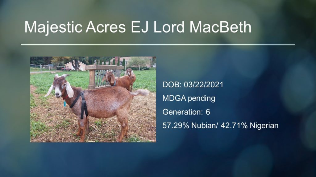We currently have 2 Mini-Nubian bucks that are registered with MDGA and 1 pending with TMGR. Clicking on each buck’s slide will take you to their individual page, except Belarius.